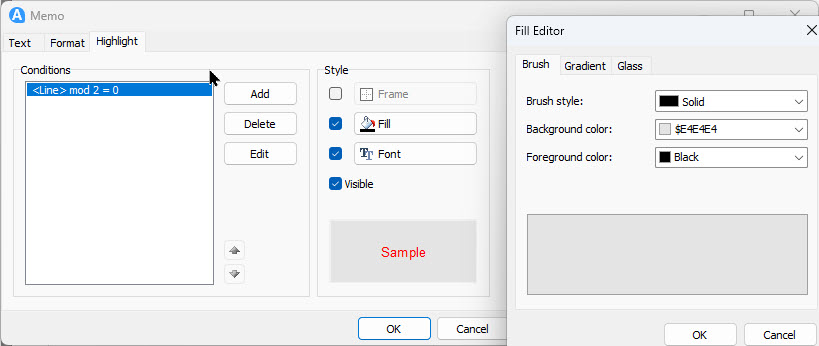 To apply alternating colors, right‑click the Text Object and select Edit to open the standard Text Object editor. Switch to the Highlight tab. In the Conditions area, click Add to create a new highlight rule. This opens the Expression Editor. In the expression field, enter: