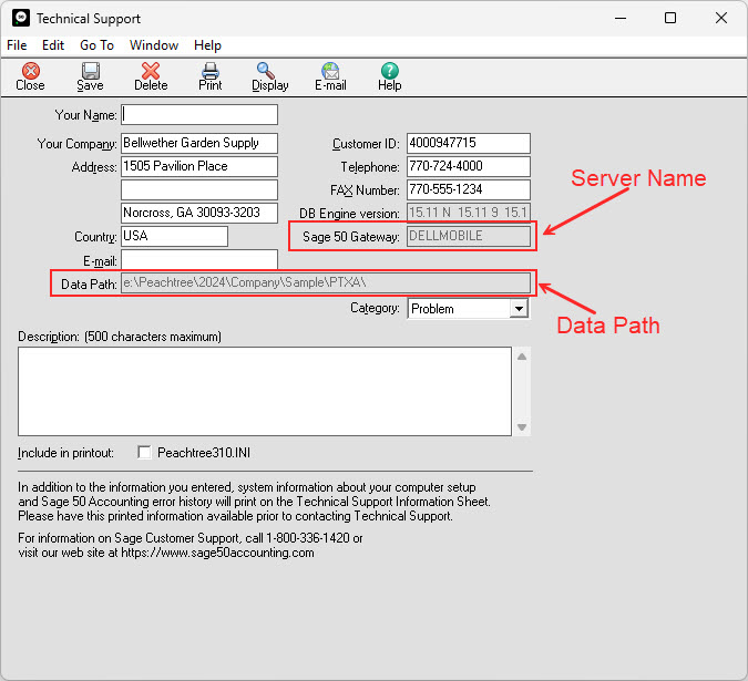 - In the Technical Support window, locate the Sage 50 Gateway value. This indicates the server name where the company data resides.